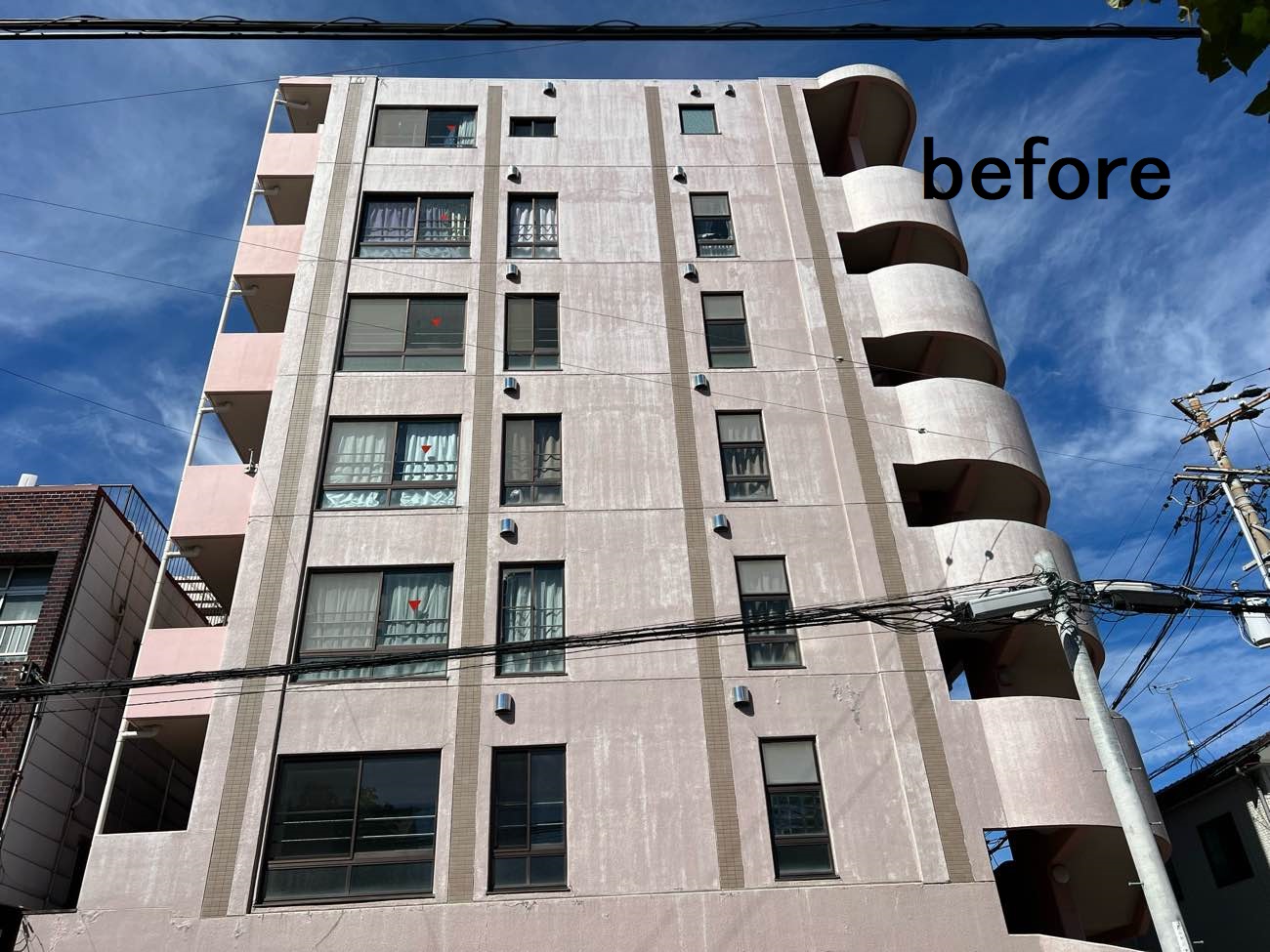 外壁塗装工事/外壁タイル打診調査/シール工事/クラック補修工事/屋上防水工事/ベランダ床防水工事 オーナー様、ご家族様のご意向で、元のピンクのお色をご希望され再現しました。クラック補修と屋上・ベランダ面の防水も終え、ご入居様に安心してお過ごし頂けます。