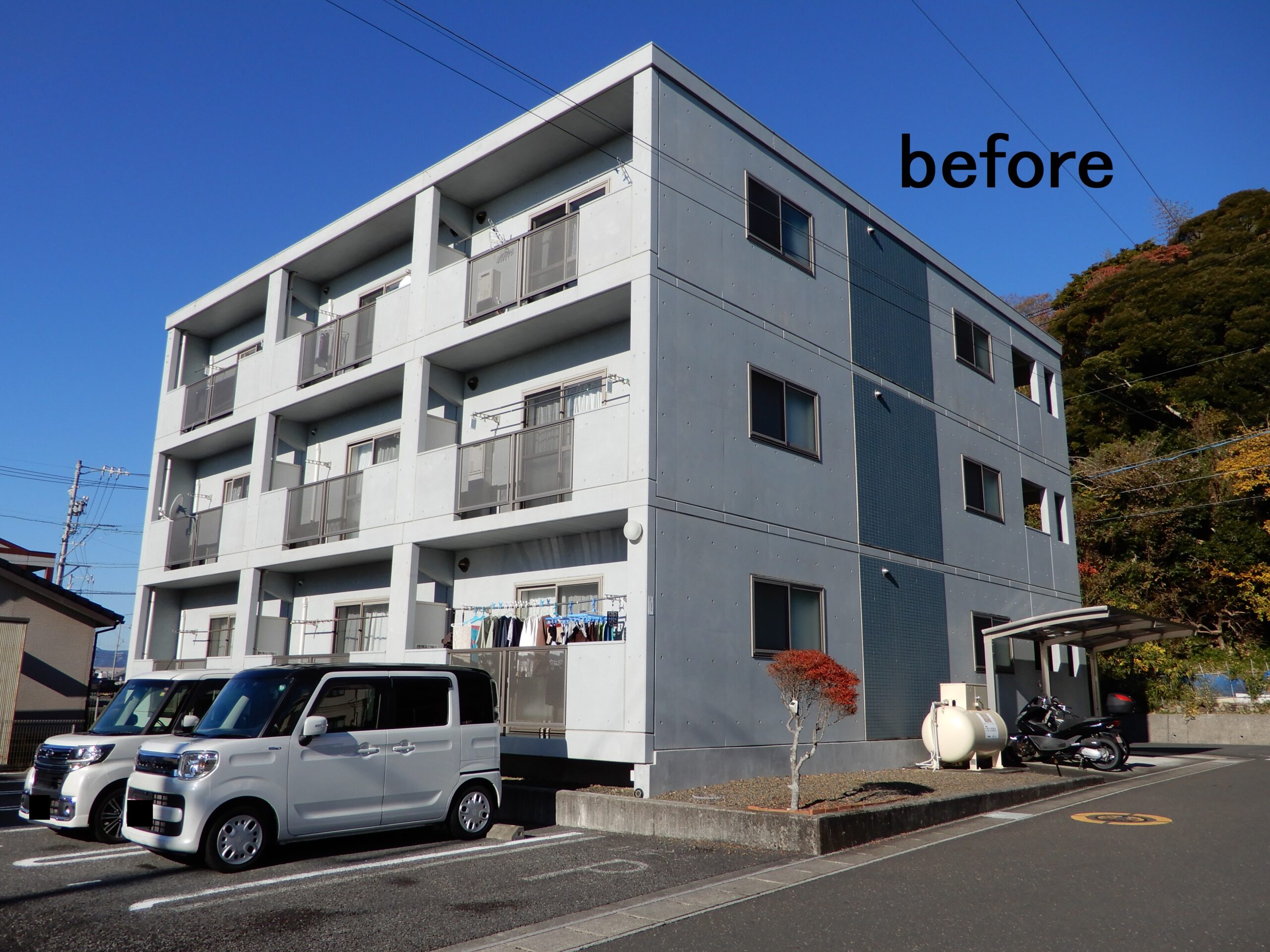 外壁塗装工事/シーリング工事 鉄筋コンクリート造3階建て、妻壁の一部にさわやかなブルーのタイルが貼られている素敵な外観の建物です。築年数が経過したことにより、外壁と屋根の塗装が劣化しており、目地シーリングも劣化していました。工事では、まず補修をしっかりやらせていただき、外壁のお色につきましては、元の色を再現して、新築時のように仕上がりました。